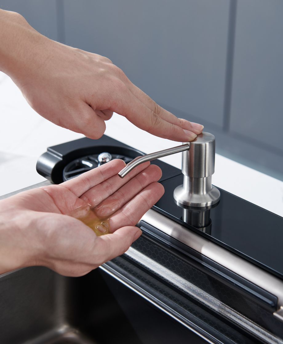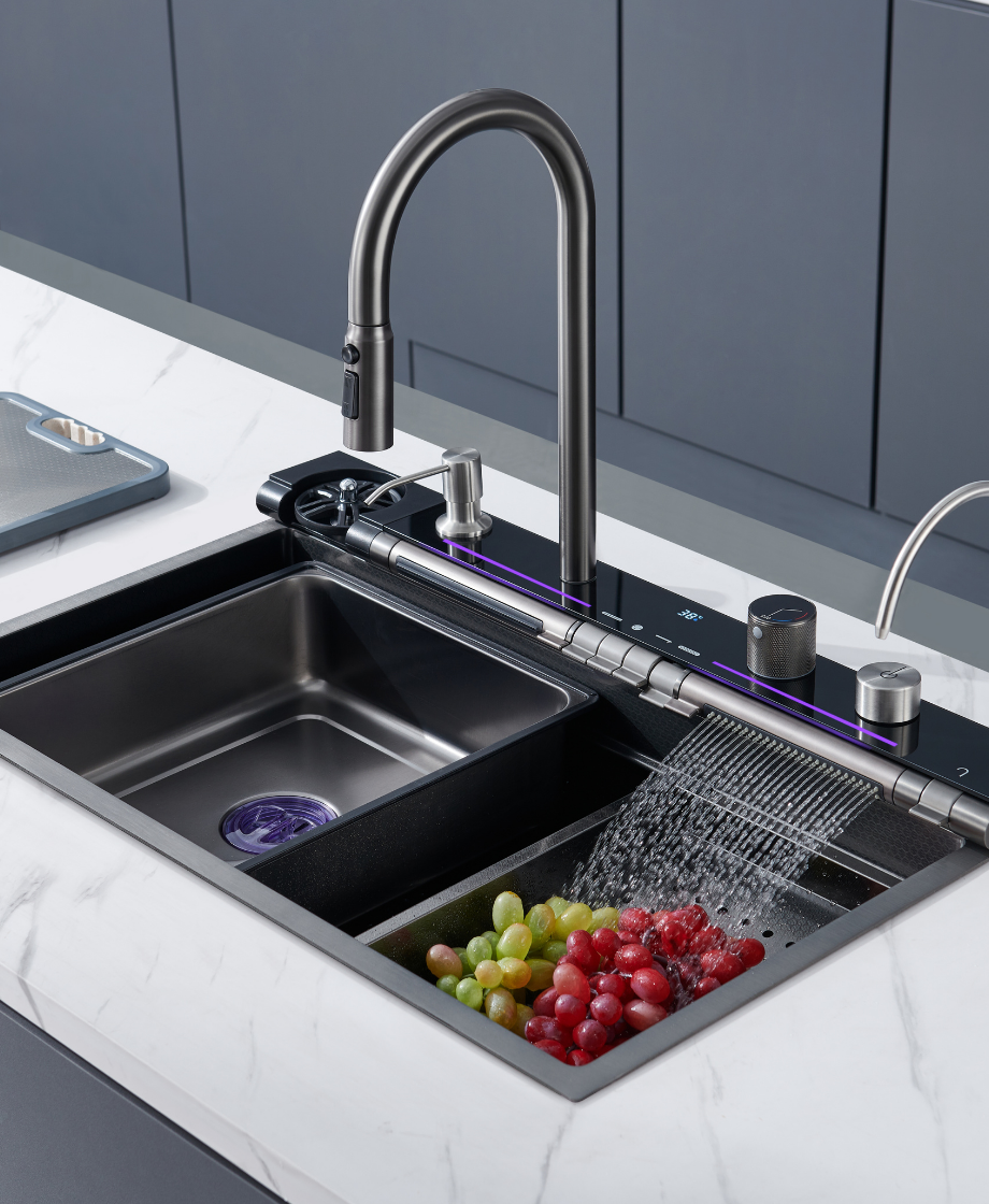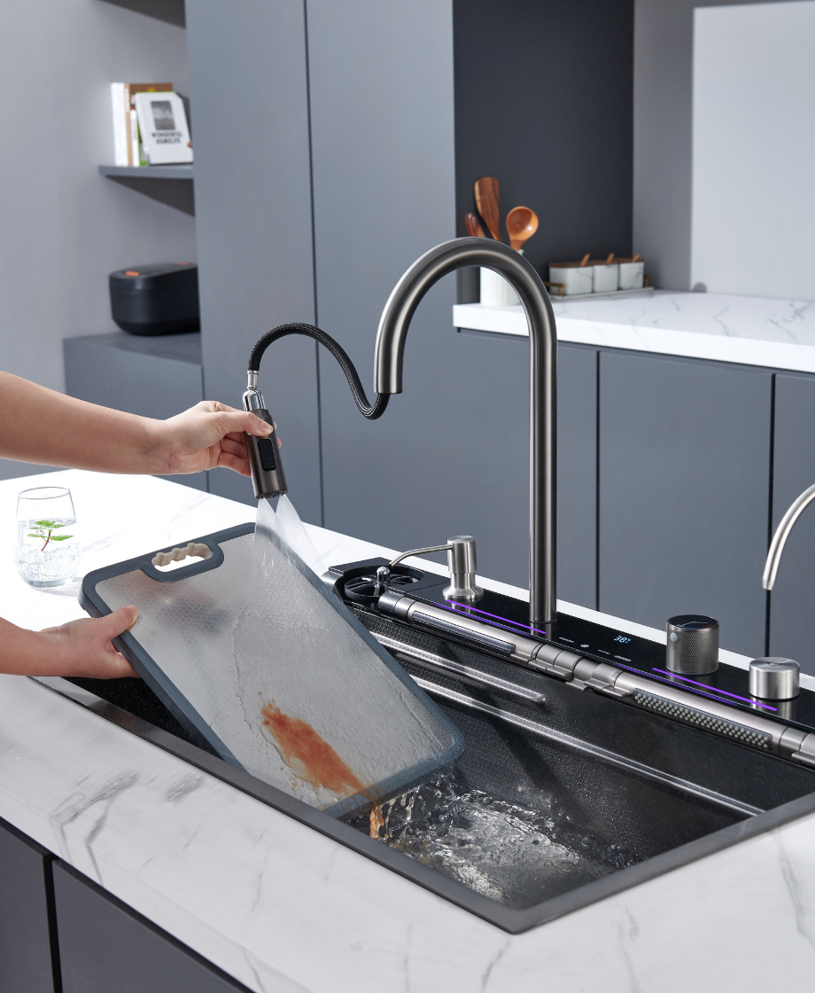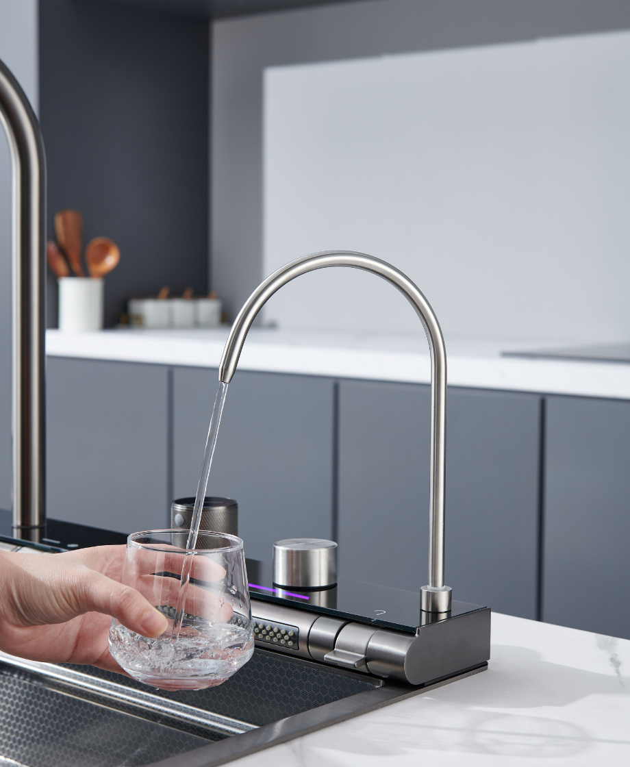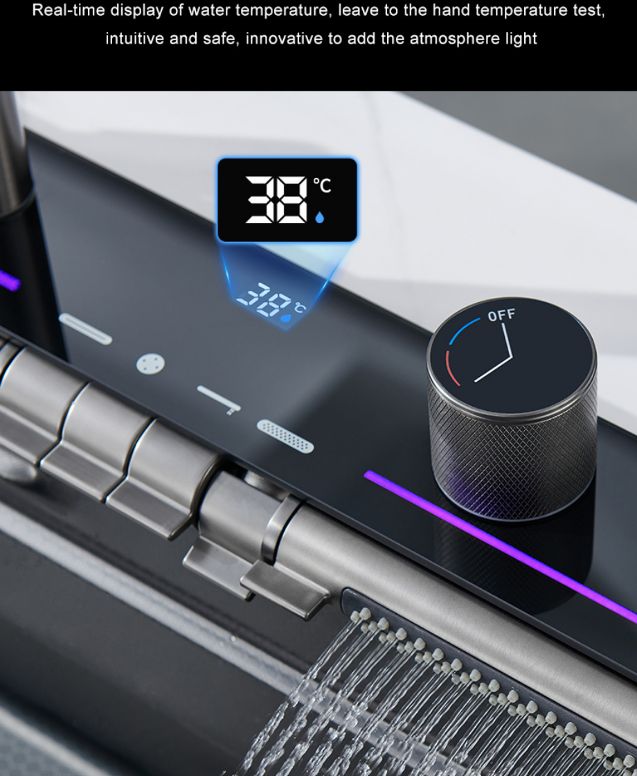 waterfalls, battery-less LED lighting and temperature display, multi flow pull-out mixer faucet, water purifier faucet, glass rinser, soap