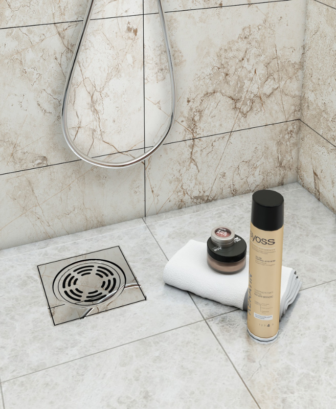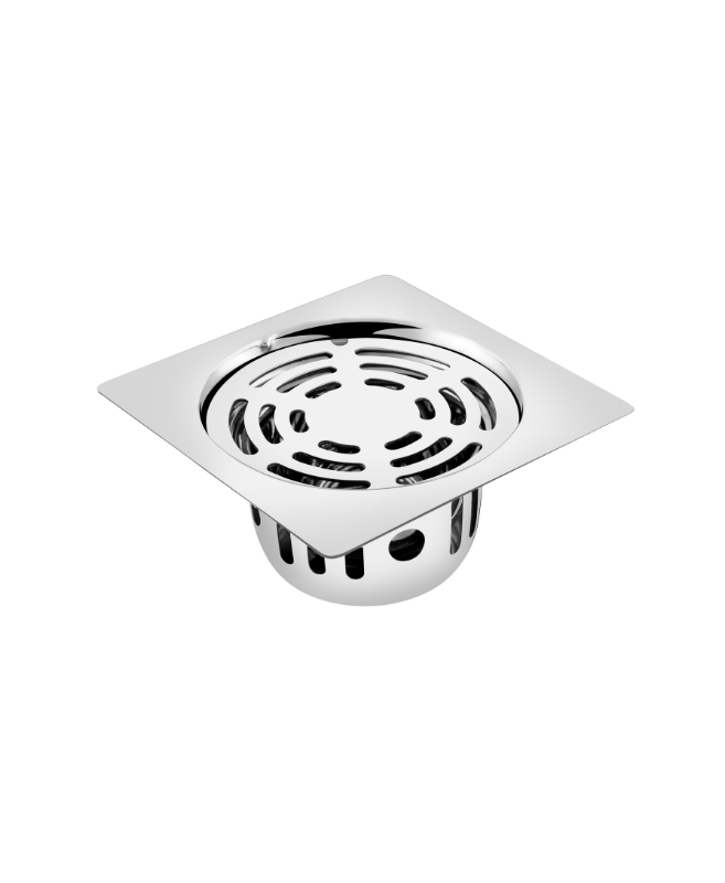 Square SUS304 drain with cockroach trap, available in elegant finishes including Br. Bronze, Rose Gold, Gold, Matt Black, and Chrome, with or without hole.